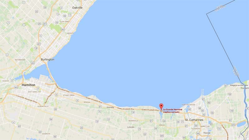 I have seen the vessel many times, and been aboard it more than once. Including before it became the burned out hulk which it is today. “La Grand Hermine“, also known as “The Big Weasel”, is located perched on the shoreline at the Jordan Harbour, just off the western shore of Lake Ontario, between Hamilton and St. Catharines.