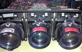 Located inside the television, behind the main viewing screen are a set of three black pipes, or posts which have a set of lenses. Once removed, these lens housing can be easily disassembled and the thick, high-end magnifying glass can be extrapolated from the units. Usually there are three. One for Red, Green, and Blue, however the lenses themselves are almost always clear. Normally the centre lens, as pictured below is the heaviest and thickest, and will provide maximum magnification.